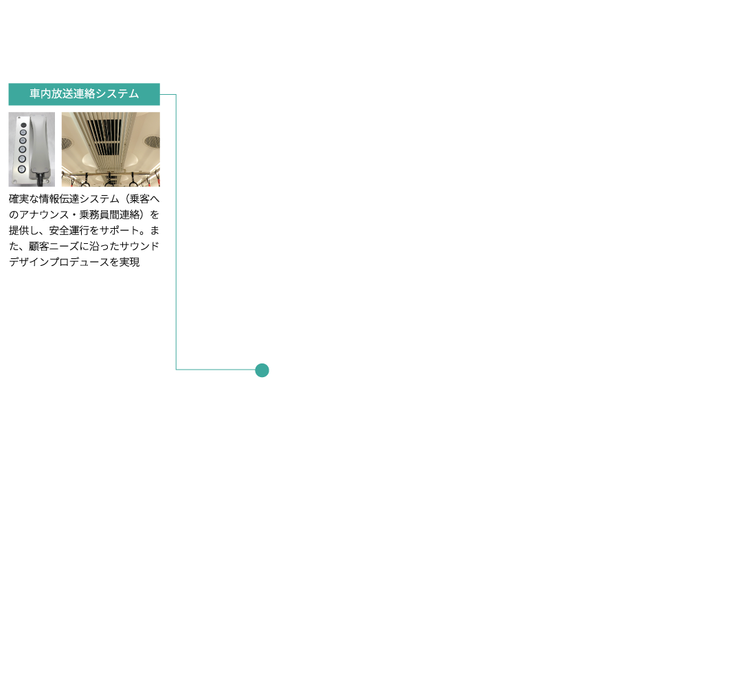 確実な情報伝達システム(乗客へのアナウンス・乗務員間連絡)を提供し、安全運行をサポート。また、顧客ニーズに沿ったサウンドデザインプロデュースを実現